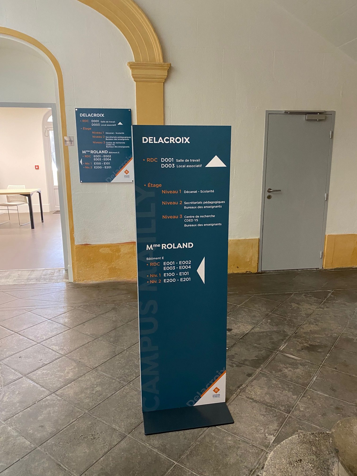 Réalisation de panneaux signalétiques + pose dépoli sur vitres et portes du Campus Mailly